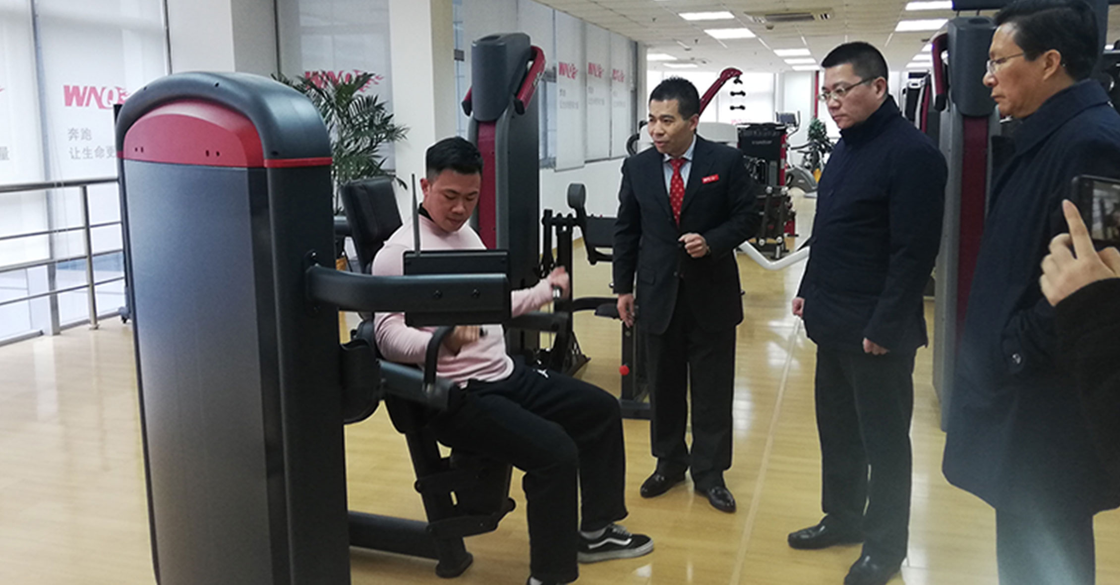 许副局长一行先参观了365英国上市集团器材展厅,对我们的企业文化、发展情况、健身器材产品等进行了详细了解,并重点关注了2018年365英国上市集团推出的F1-7000美格力量单站系列、W2000变形金刚系列和F4、F6跑步机等新品,365英国上市集团的力量单站产品大管径的优质选材、源自美国的外形设计和新品跑步机的智能化等特点深得领导一行的肯定。